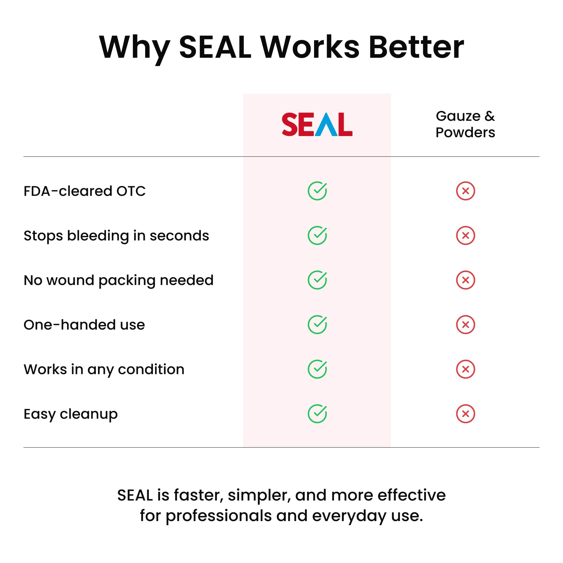 SEAL's patented aerosol delivery system makes application simple and effective, allowing for quick action when it counts the most. The 1.5oz size is perfect for portable emergency kits, ensuring you’re always prepared in any situation — from minor cuts and abrasions to more serious injuries.